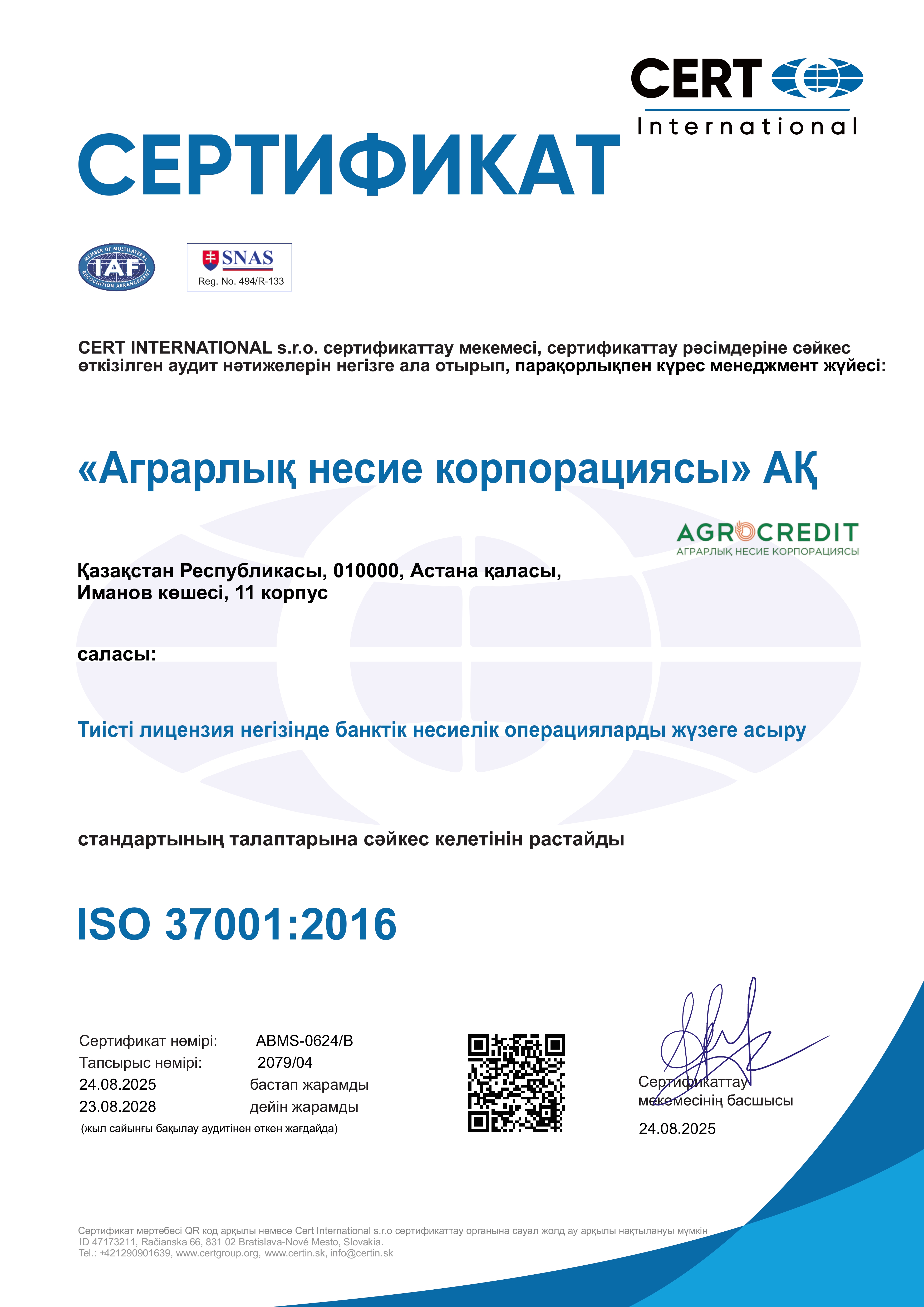 2022 жылдың қыркүйегінде "Аграрлық несие корпорациясы" АҚ еншілес ұйымдардың алғашқысы болды Қарсы іс-қимыл менеджменті жүйесінің сертификаттық аудитінен өткен "Бәйтерек" холдингі сыбайлас жемқорлық ISO 37001. Менеджмент жүйесі және сыбайлас жемқорлыққа қарсы саясат сыбайлас жемқорлық тәуекелдері, ұйымның іскерлік сенімділігі мен беделін арттыру. Нәтижелері бойынша аудит сертификат және сертификаттау жөніндегі органның тауар белгісін алды. Бұл стандарт бағытталған парақорлықтың алдын алуға, тараптан бәсекеге қабілеттілік пен сенімді арттыруға клиенттер мен жұртшылықтың салауатты жұмыс істеуін және бәсекелестік ортаны қамтамасыз ету Бір мезгілде корпоративтік нығайту кезінде қоғам мен барлық мүдделі тараптардың мәдениеттер.
