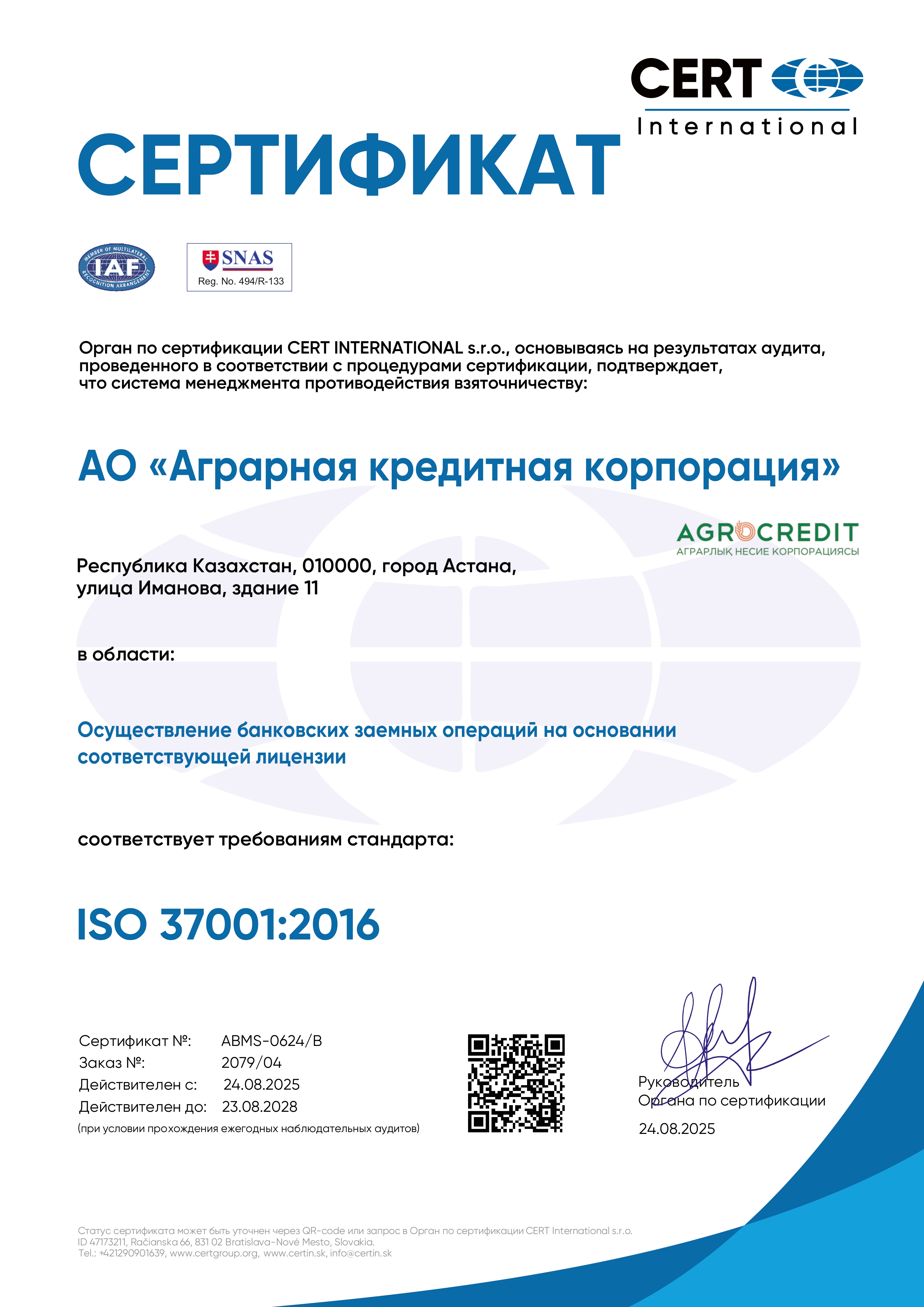 В сентябре 2022 года АО «Аграрная кредитная корпорация» стала первой из дочерних организаций Холдинга «Байтерек», прошедшей сертификационный аудит системы менеджмента противодействия коррупции ISO 37001. Система менеджмента и антикоррупционная политика помогают снизить коррупционные риски, повысить деловую надежность и авторитет организации. По результатам аудита получен Сертификат и товарный знак органа по сертификации. Данный стандарт направлен на предотвращение взяточничества, повышение конкурентоспособности и доверия со стороны клиентов и общественности, обеспечение здорового функционирования и конкурентной среды для Общества и всех заинтересованных сторон при одновременном укреплении корпоративной культуры.